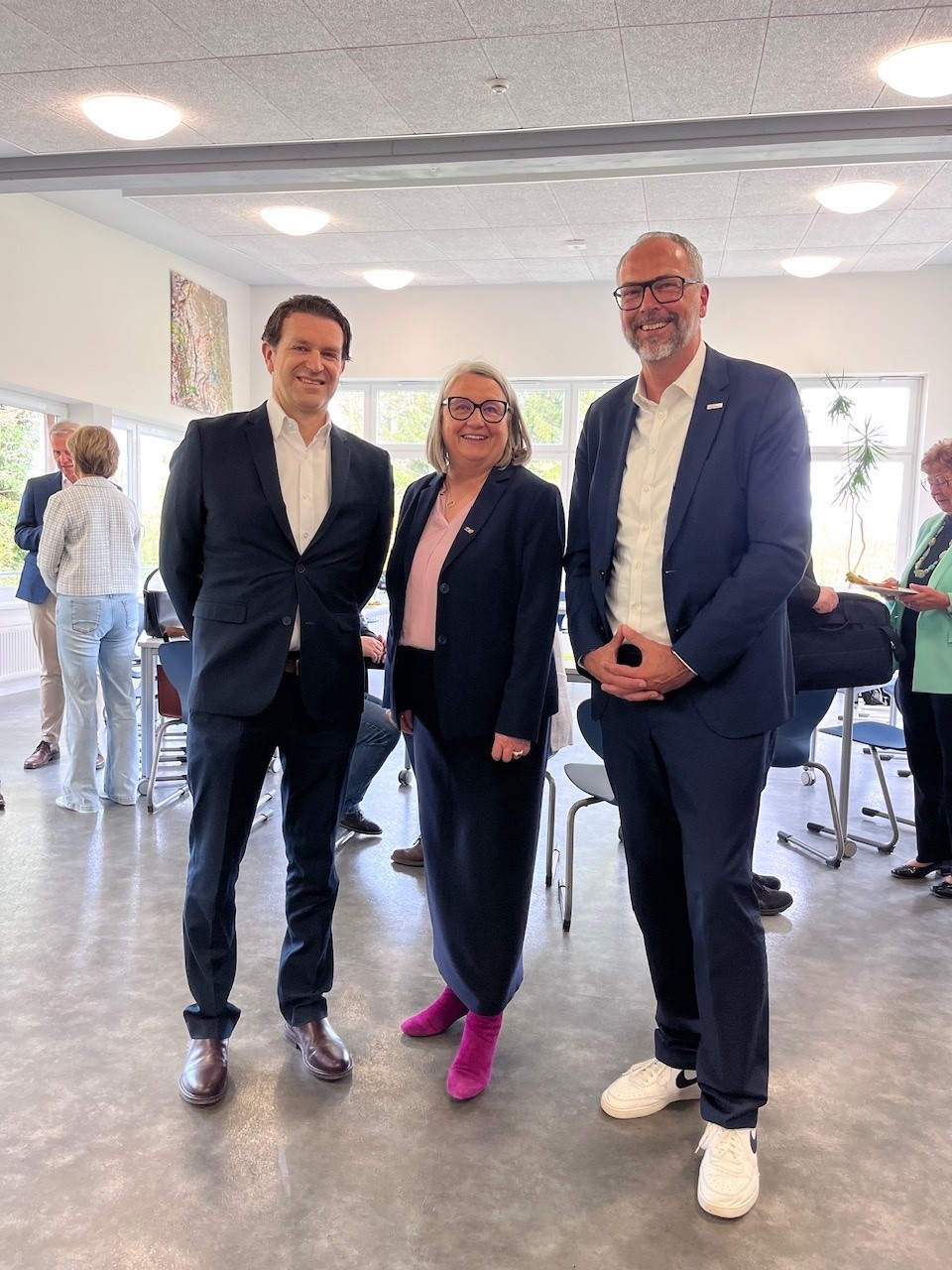 Ministerin Dr. Dorit Stenke mit Arndt Schanze (Vorstand Hansebelt e. V., rechts) und Simon Franke (Schulleiter, links).